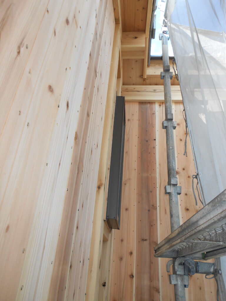 内部では造作工事が本格的に進みます。2階の床仕上げ板が施工され、杉の無垢板ならではの美しい木目と温かみのある足触りが生まれました。階段も杉の板目が美しい仕上がりです。昇りやすさに配慮した余裕のある寸法で、自然素材に囲まれた階段室は杉の香りをいっそう感じられる空間になっています。